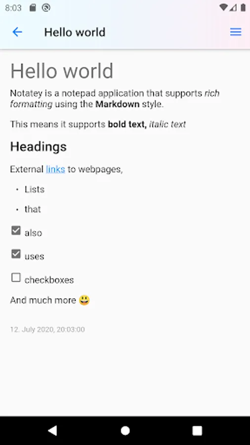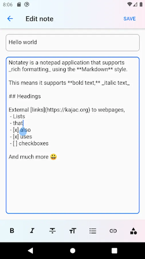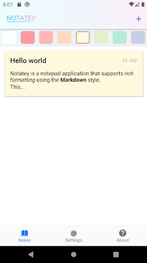Notatey is a small, simple notepad application that supports markdown formatting. Create notes without any formatting at all, or use Markdown do put your notes to life.