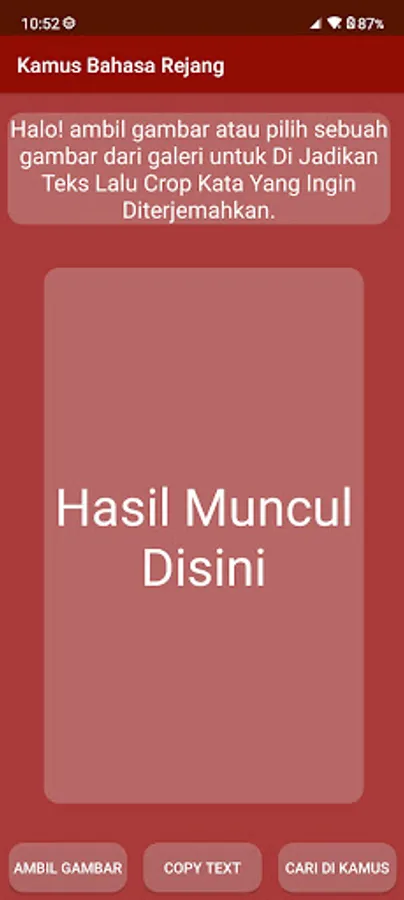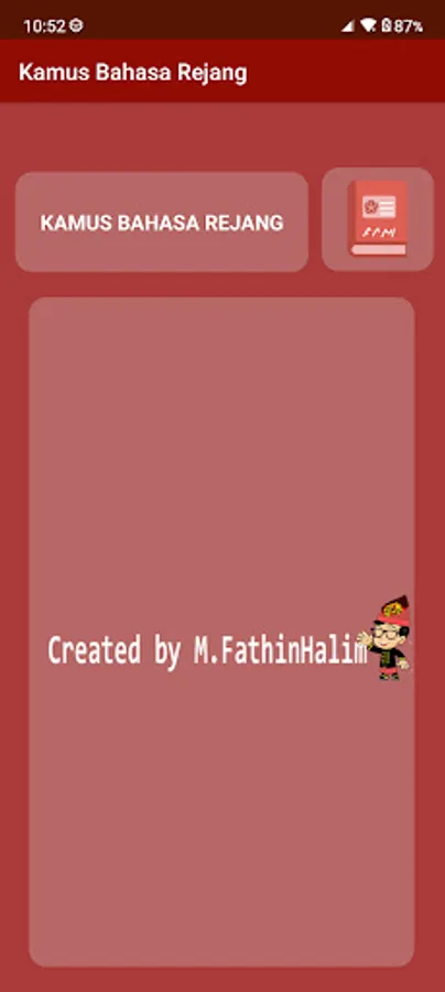 The Rejang Language Word Dictionary developed by M. Fathin Halim, a junior high school student, is an Android-based application that translates between Indonesian and Rejang! This version, God willing, will continue to be updated.