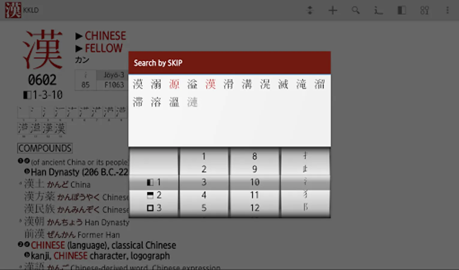 This up-to-date dictionary covers 3,002 kanji entry characters – 772 more than in the original edition – and covers all the characters in the recently revised Jōyō Kanji and Jinmei Kanji lists prescribed by the Japanese government. This app gives learners quick access to all the benefits of the print edition, plus additional functionality made possible by the smartphone platform, including quick and intuitive interfaces for looking up kanji by SKIP or by radical, the ability to toggle between kana and romaji display for readings, various additional ways to look up kanji or compounds (eg. by on and kun readings, English meaning, or SKIP number), animated stroke-order diagrams, context-sensitive pop-ups, and much more.