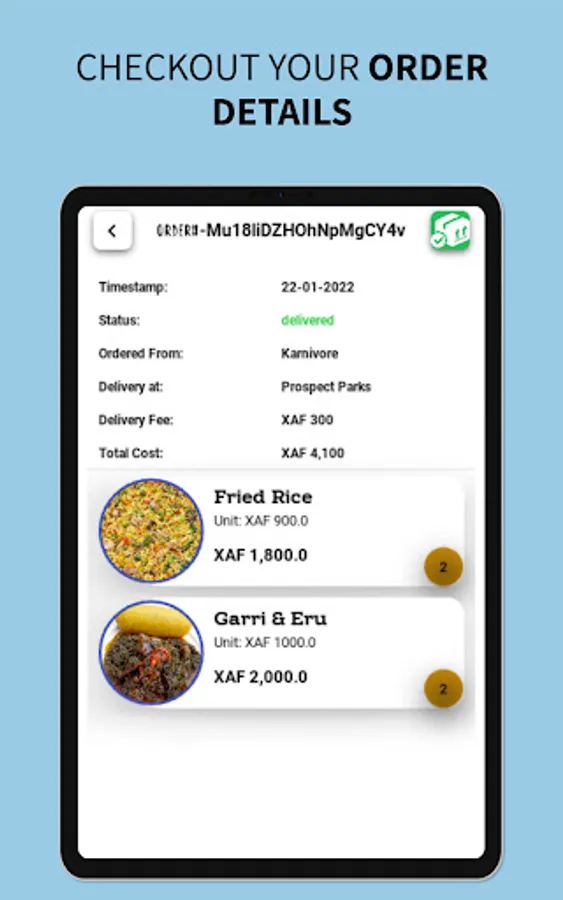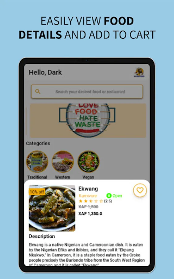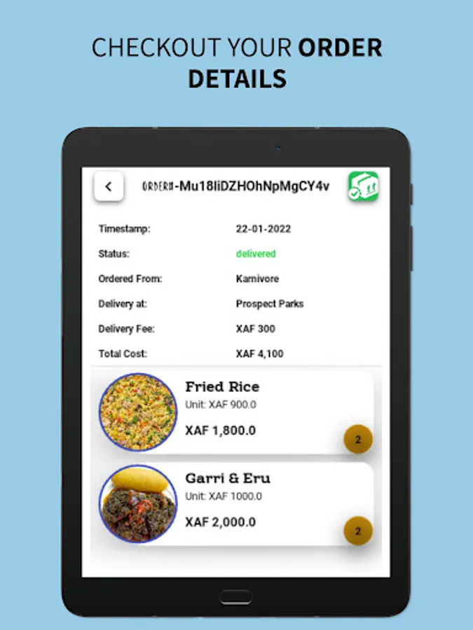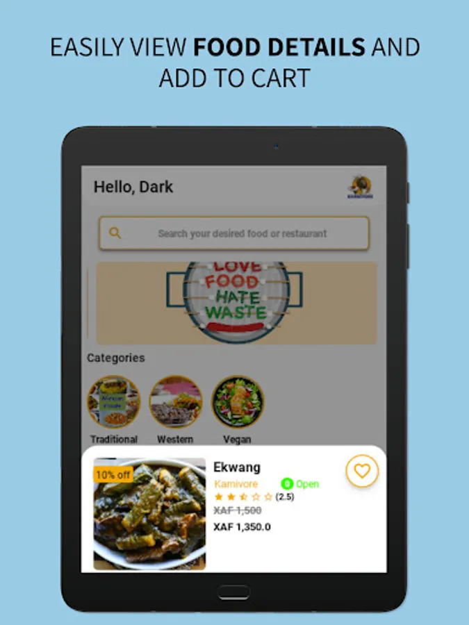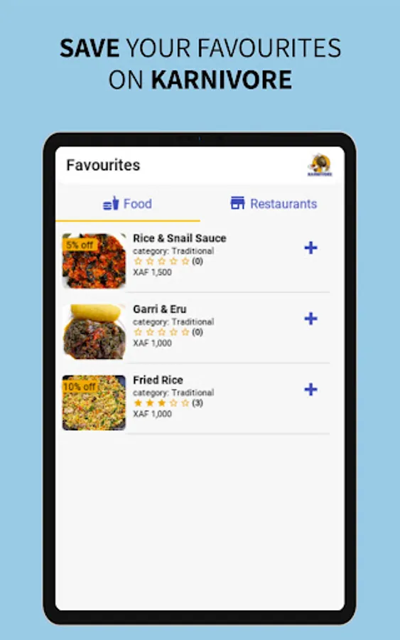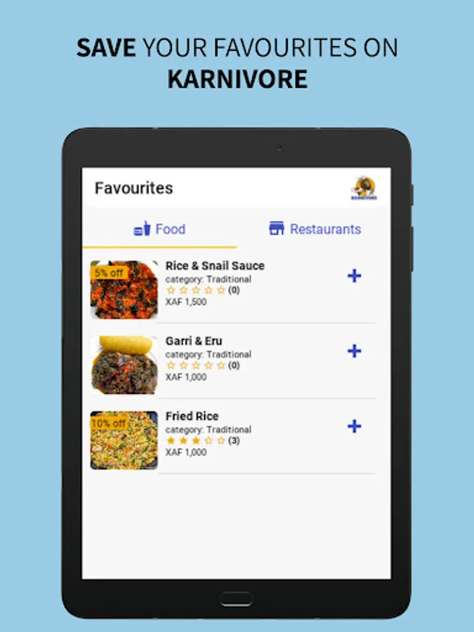Karnivore is a food delivery app affiliated with Karnivore Restaurant for food deliveries. The app will be piloting in Buea, Cameroon. Clients will be order food and have it delivered at specific delivery locations which is close to their current location.