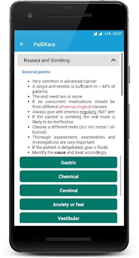 The app is suitable for staff working in rural settings and those in hospital and primary care with little or experience in Palliative Care. It was designed specifically for use in India, with the cost and of medicines and non-pharmacological interventions taken into account.