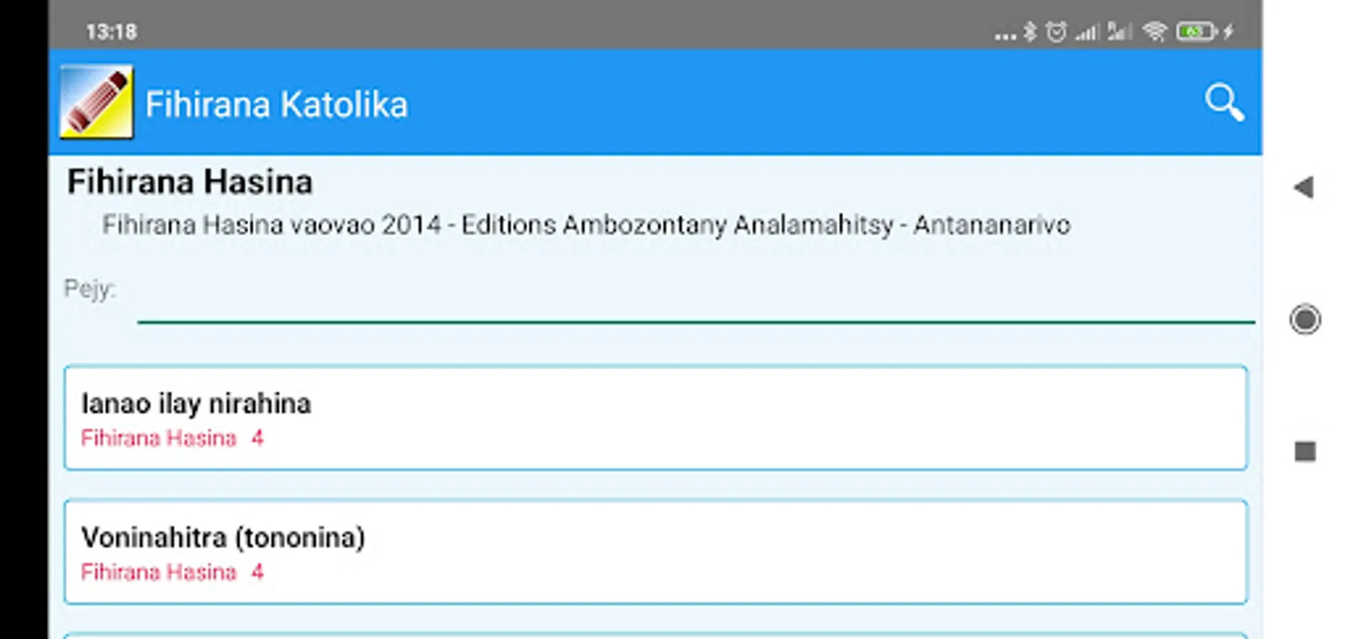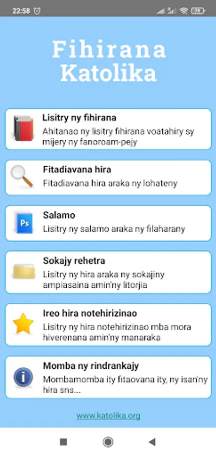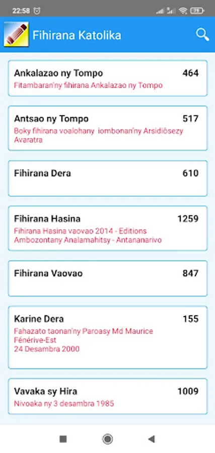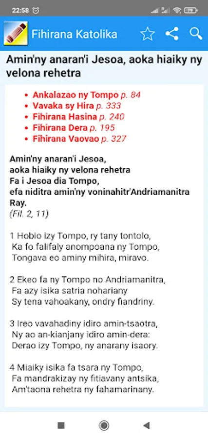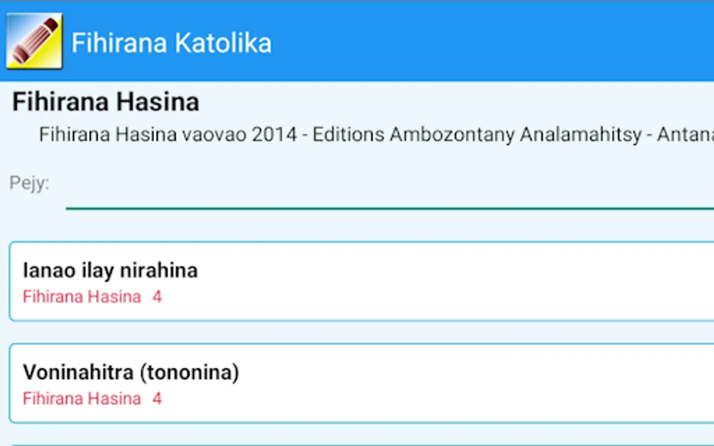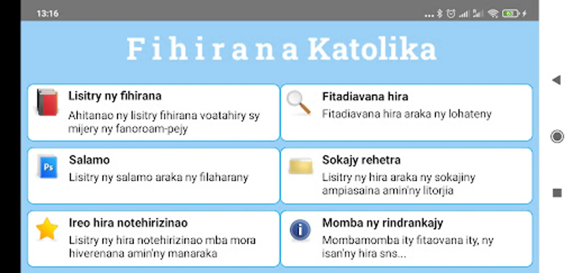 The Fihirana Katolika Malagasy Catholic hymns or application tries to put in one place all the songs in Madagascar that can be used in the liturgy of the Catholic Church.