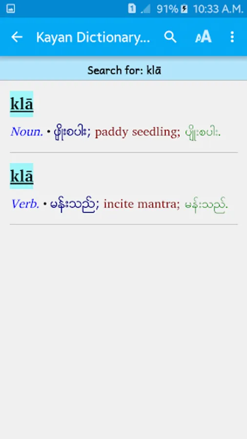 This lexicon gives glosses of Kayan words in Myanmar and English. You can search the dictionary in any of those languages (providing your phone has the capability). This edition of the app uses Zawgyi font and encoding instead of Unicode. If the text on the initial screen appears mixed up, that means you need the Unicode version of the app instead, which you can find here: https://play.google.com/store/apps/details?id=org.kayan.lilai.kek2016