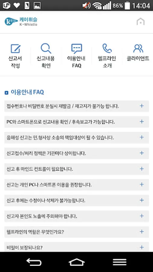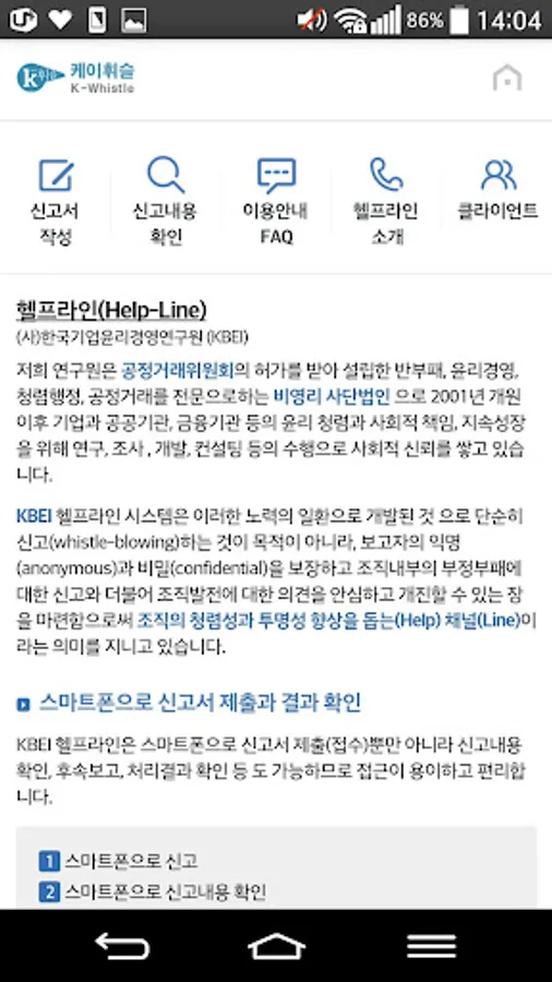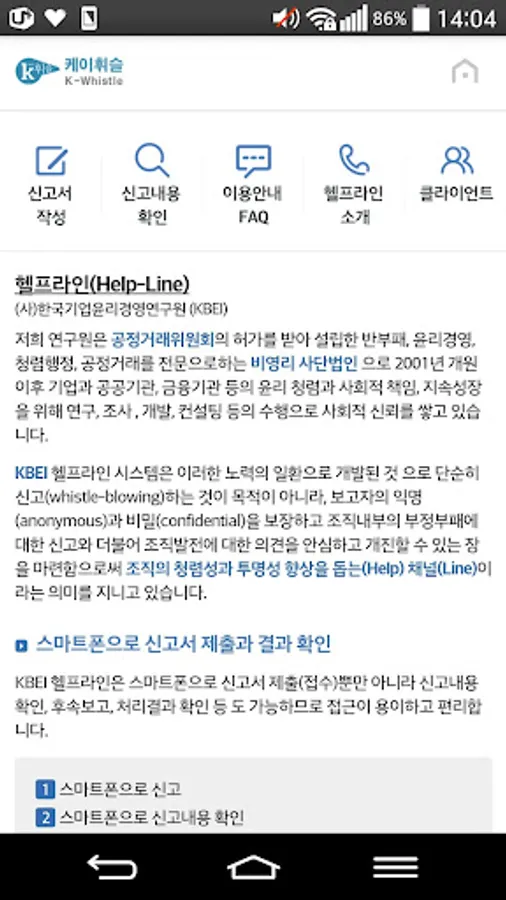케이휘슬은 해당 조직의 부정비리를 알고 있는 내부 임직원 혹은 외부 이해관계자가 안심하고 신고 할 수 있는 부정부패 신고 APP 입니다.