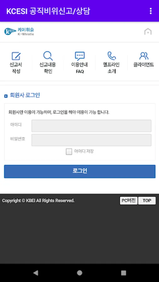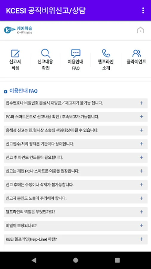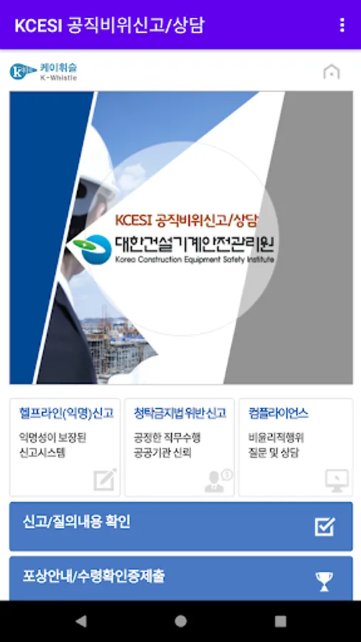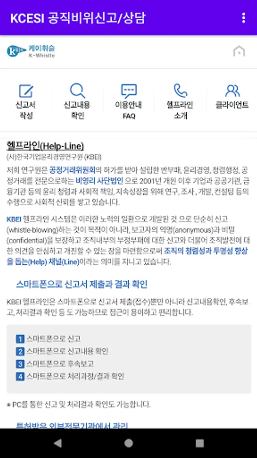KCESI 공직비위신고/상담 APP을 제작, 배포하고 있는 한국기업윤리경영연구원(KBEI)은 기업, 금융, 공공기관의 윤리적인 경영을 지원하기 위하여 설립된 국내 최초의 윤리경영 전문 연구기관 입니다.