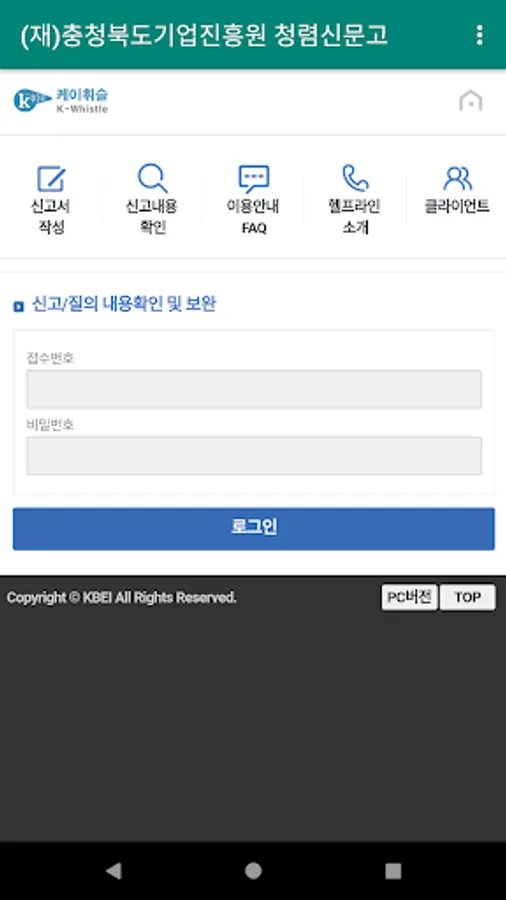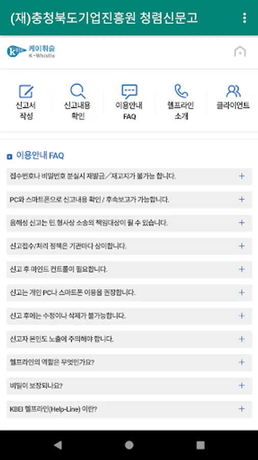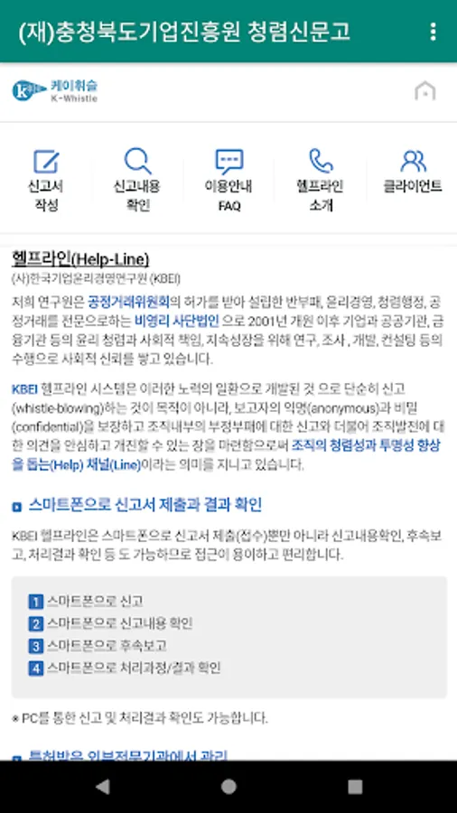 (재)충청북도기업진흥원 청렴신문고는 해당 조직의 부정비리를 알고 있는 내부 임직원 혹은 외부 이해관계자가 안심하고 신고 할 수 있는 부정부패 신고 APP 입니다.