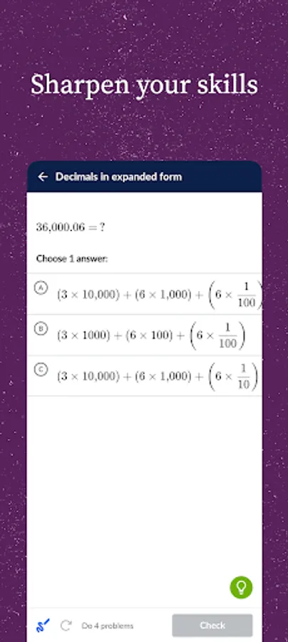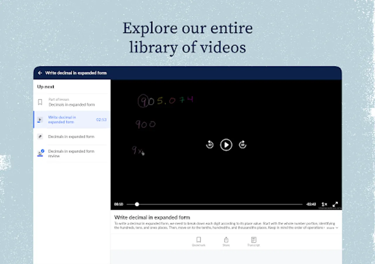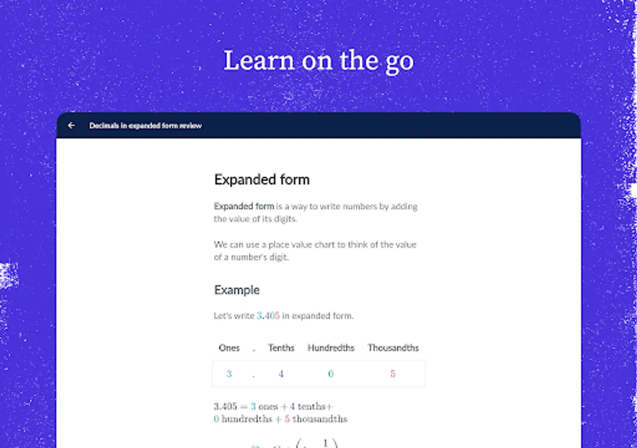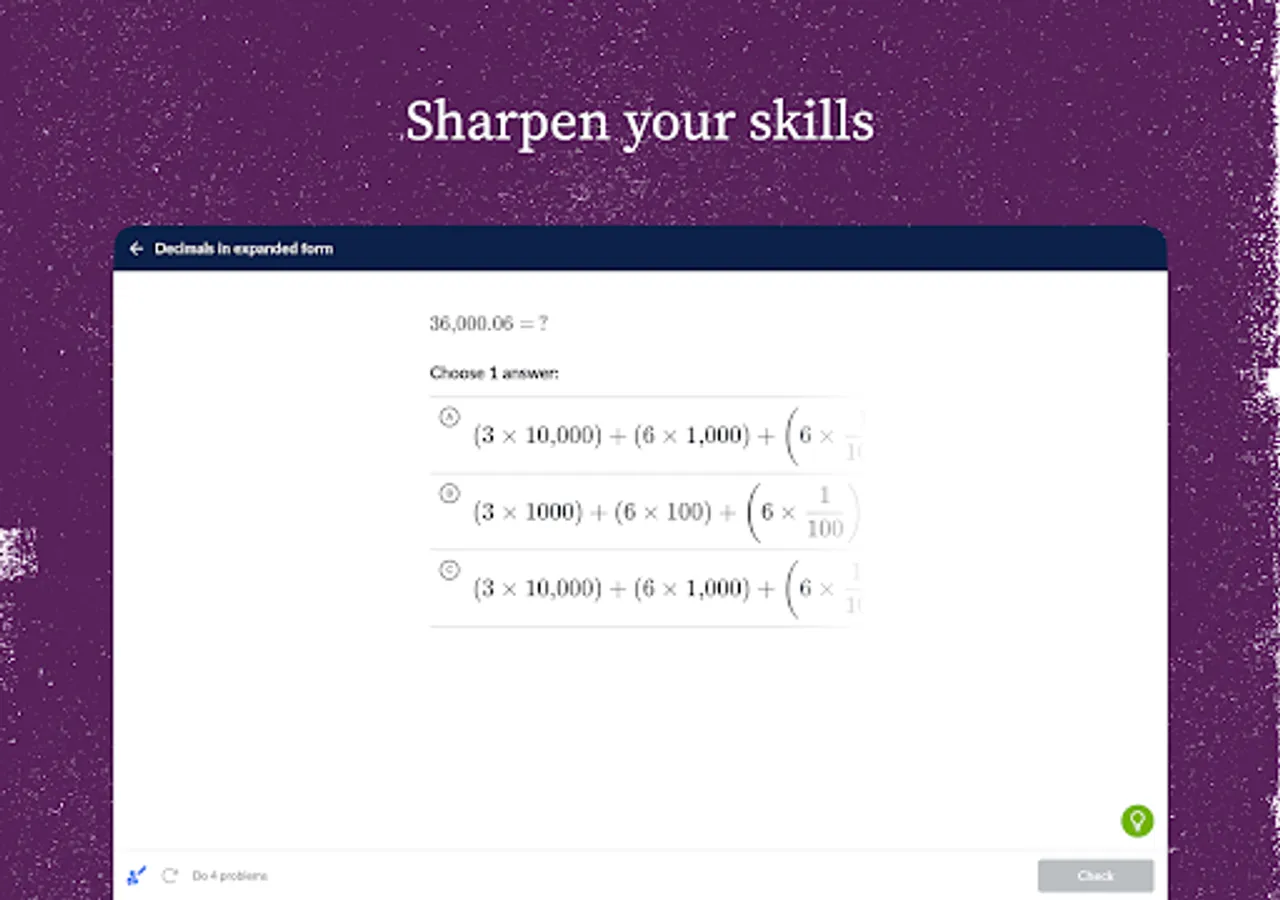 - Sharpen your skills: Practice exercises, quizzes, and tests with instant feedback and step-by-step hints. Follow along with what you're learning in school, or practice at your own pace.
