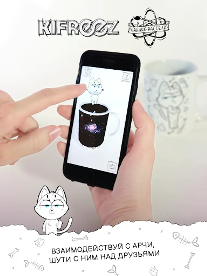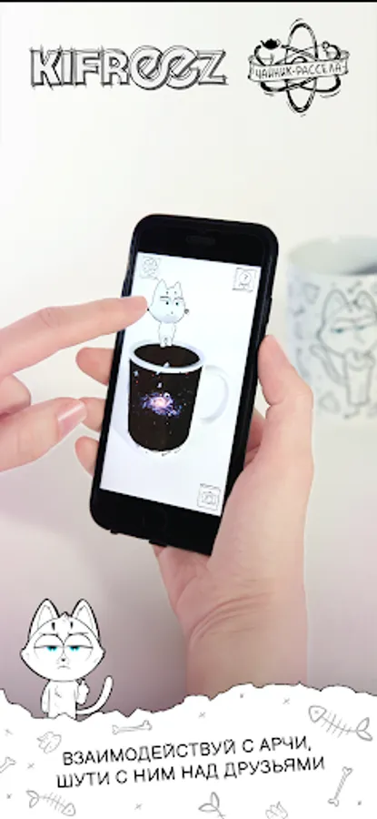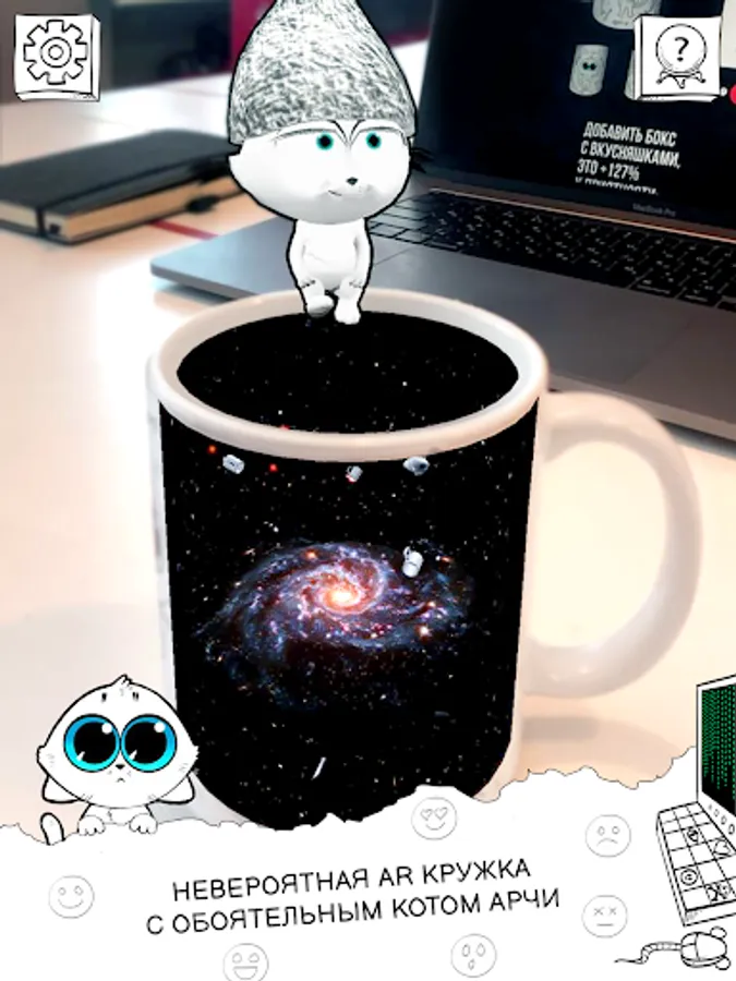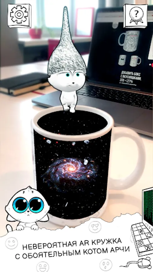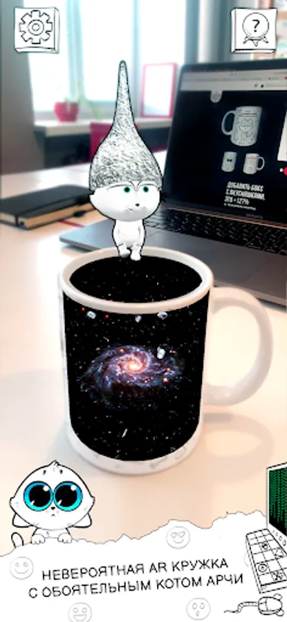 Meet Archy, our protagonist who is clearly not famous for his good manners, for example, when friends come to me, I always make them coffee in a mug with Archy, and when I point my phone at the mug Archy pops up, and he will always do his dirty business in it, oh well, such are his jokes. And he has a lot of tricks in store, which makes this mug even cooler.
