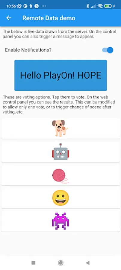 The app has a selection of features to explore. Of particular interest for partners thinking about "concrete utopias" is the "location" tab, which finds out some features of your current location, and the "remote data" tab, which allows you to give feedback live to a server.