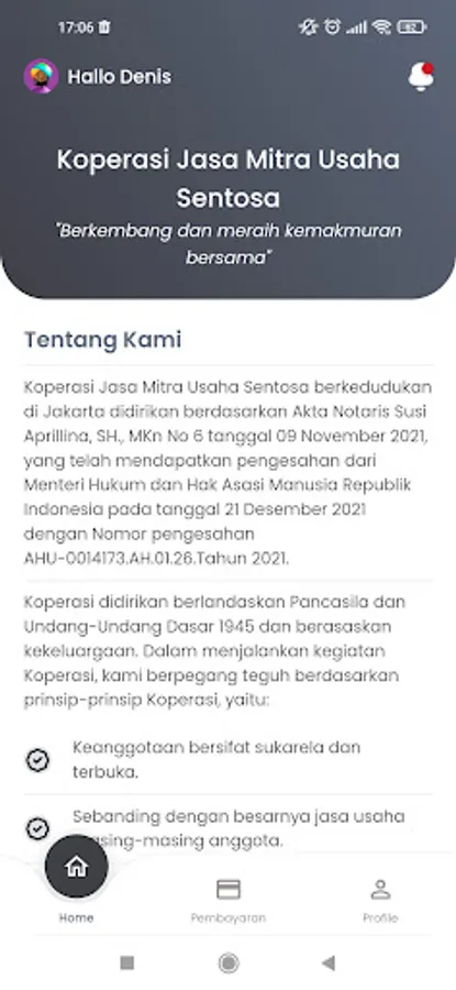 The Sentosa Mitra Usaha Cooperative domiciled in Jakarta was established based on the Notary Deed of Susi Aprillina, SH., MKn No. 6 dated 09 November 2021, which was approved by the Minister of Law and Human Rights of the Republic of Indonesia on 21 December 2021 with validation number AHU-0014173 .AH.01.26.Year 2021.