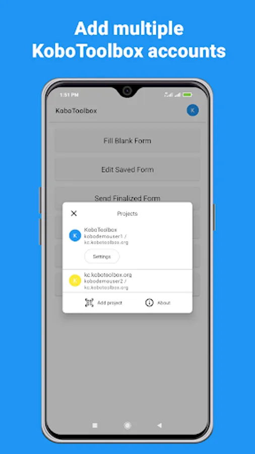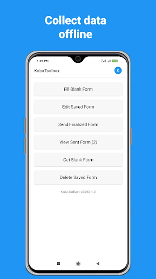 This app requires a free KoboToolbox account: Before you can collect data create a free account with your computer on www.kobotoolbox.org and create a blank form for data entry. Once your form is created and active, configure this app to point to your account, following the instructions in our tool.