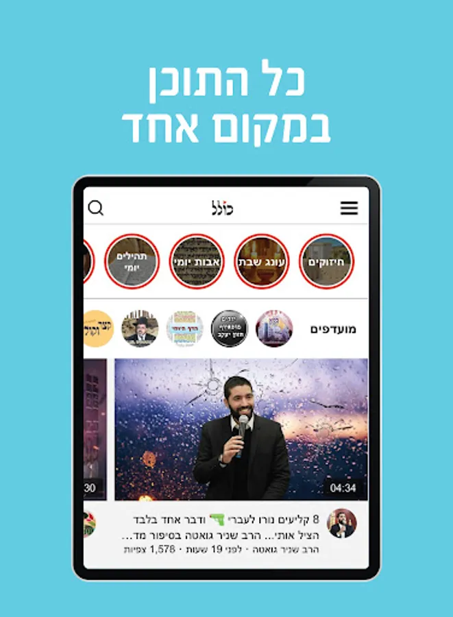 אפליקציית כולל מציעה את ספריית הוידאו הגדולה ביותר של שיעורי תורה, הלכה, מוסר והשקפה מטובי הרבנים, המרצים והארגונים בארץ ובעולם.