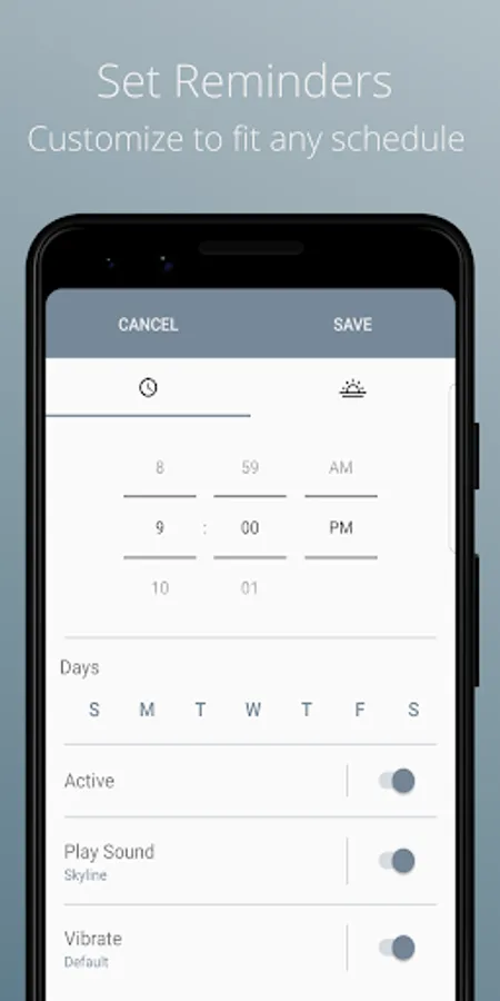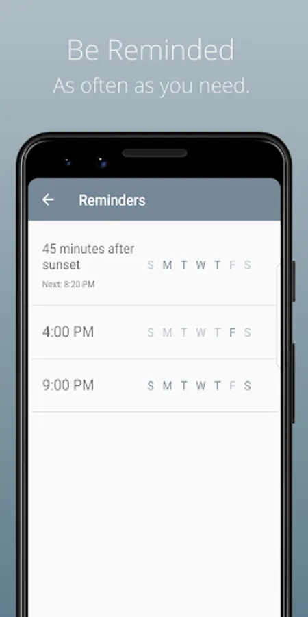 - Set unlimited reminders, customized to the time of day and days of the week that best fit your schedule.
