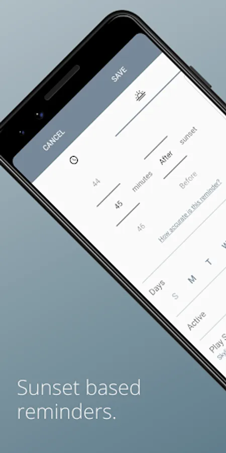 - Reminders can be set to a specific time of day, or up to 90 minutes before or after sunset.