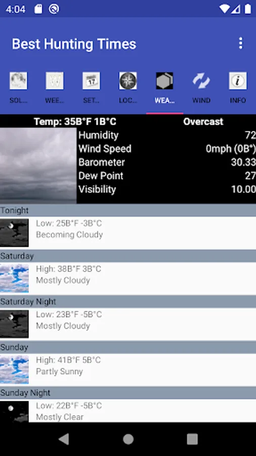 Weekly view, and daily view. Weather, wind condition and forecast. Determine Best Hunting Times for any date, any location.