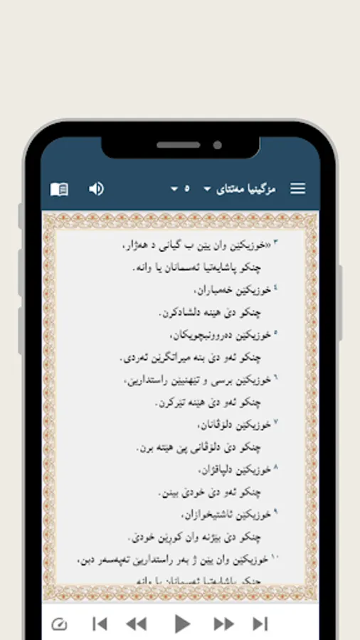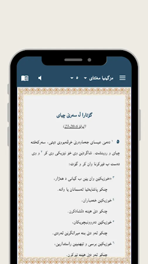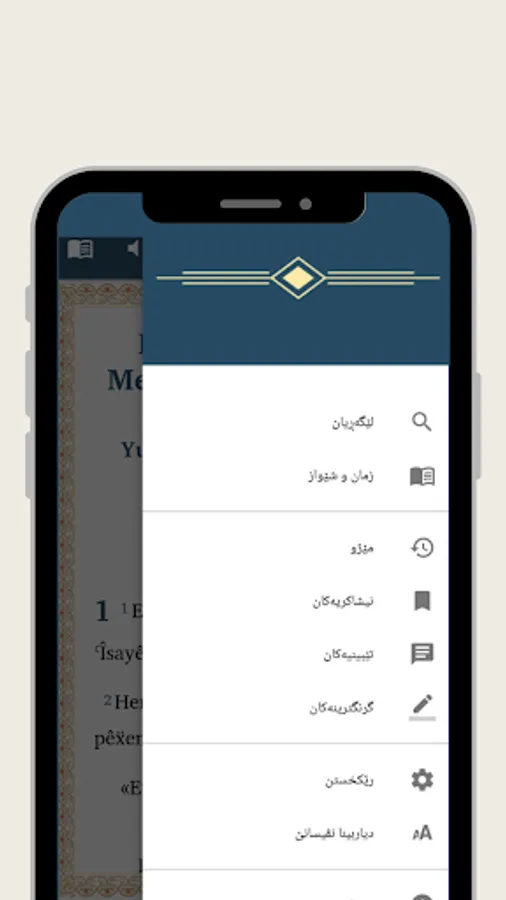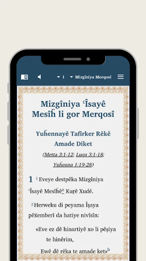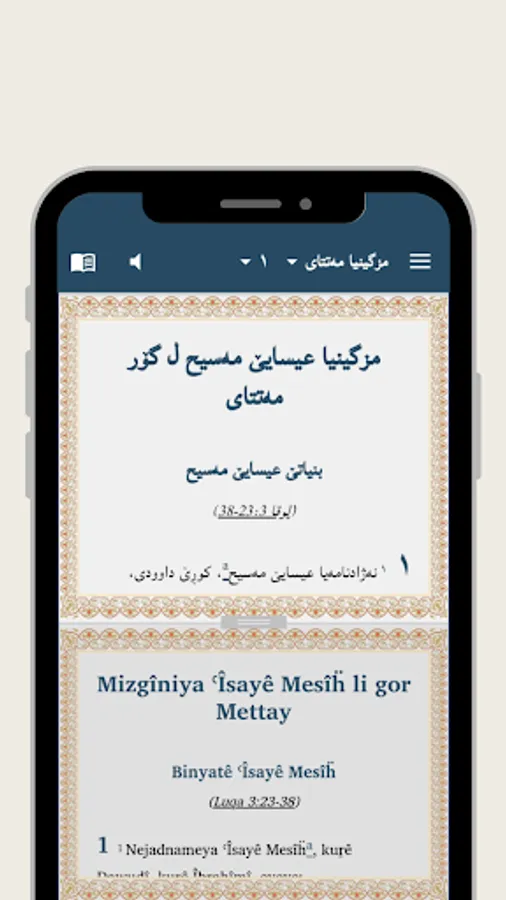 With this App, people can read and hear the New Testament of the Holy Bible (The Holy Injeel with portions of the Tewrat and Zebûr and other writings of the Old Testament) in the Behdini dialect of the Kurdish language. One can select the text by chapter and verse, or search by word or phrase. The meanings of unfamiliar words are explained by means of footnotes and a glossary.