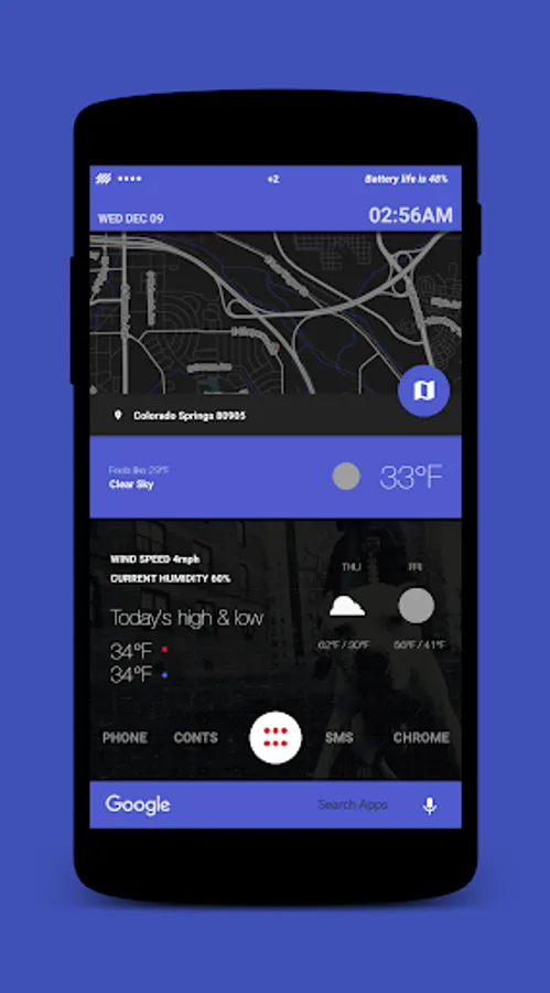 A 3 screen set up with a left sidebar, road map as your home screen and a music player to your right. Weather pop-up with short two day forecast, from home screen.