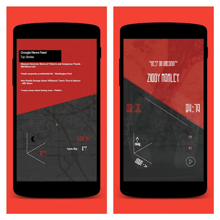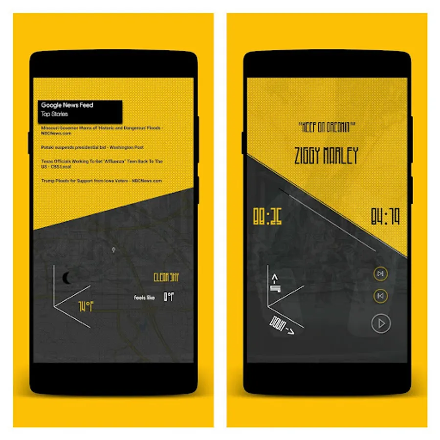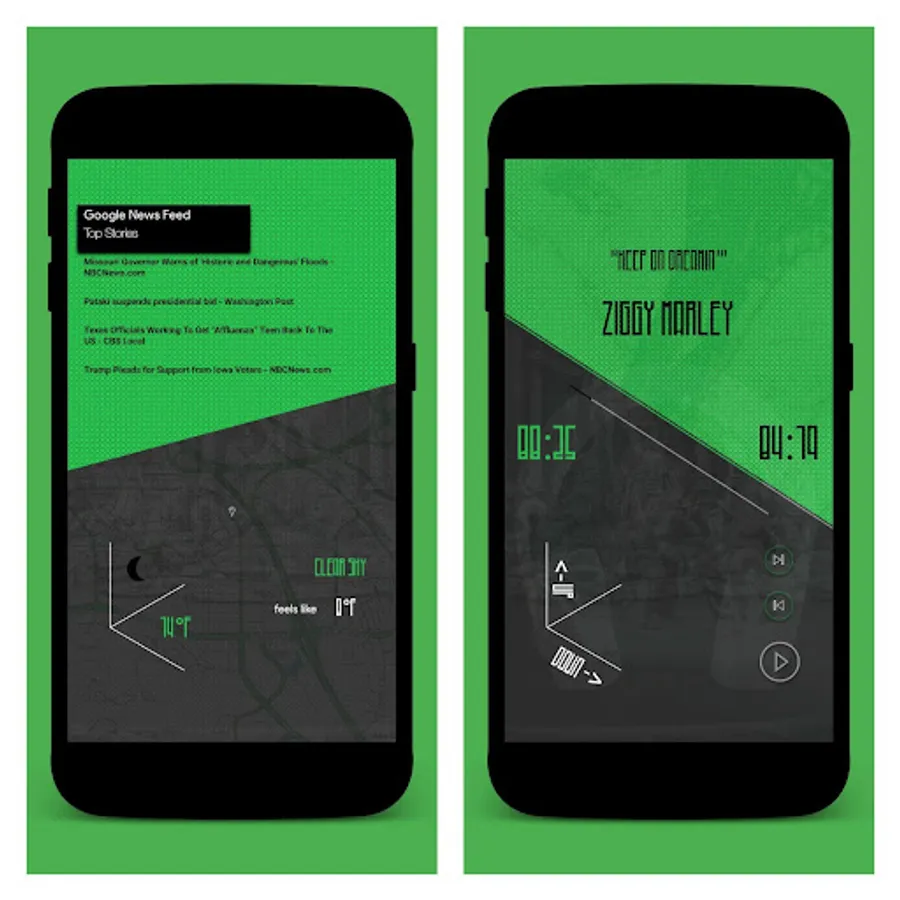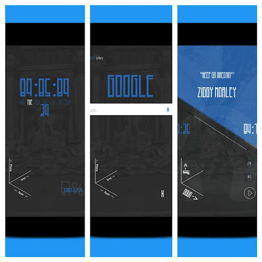 A three screen preset for KLWP. Google search bar and Play Store sidebar toggle switches. Music page and News/Weather page.