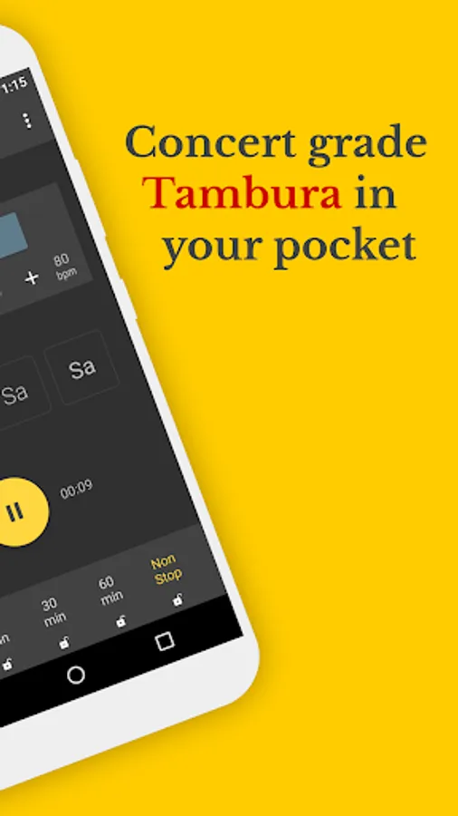 ★ Playback duration presets. You can play tambura for a specific duration (15 min, 30 min, or 1 hr). This simplifies keeping track of time for classes and practice sessions. We also know that soothing tambura sound is used in meditation. So this feature can also help meditators.