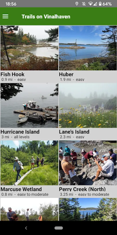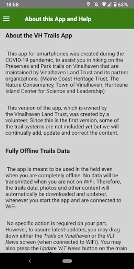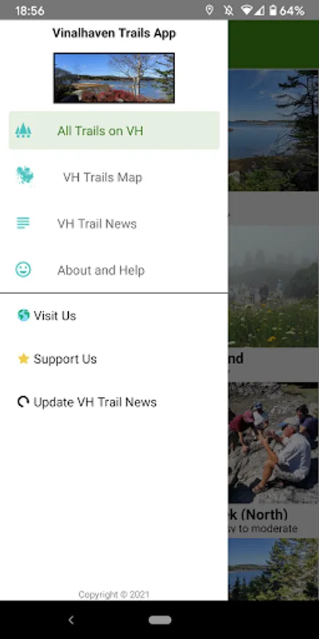 A drawer menu at the Home Screen provides additional functions such as a link to Vinalhaven Land Trust News.