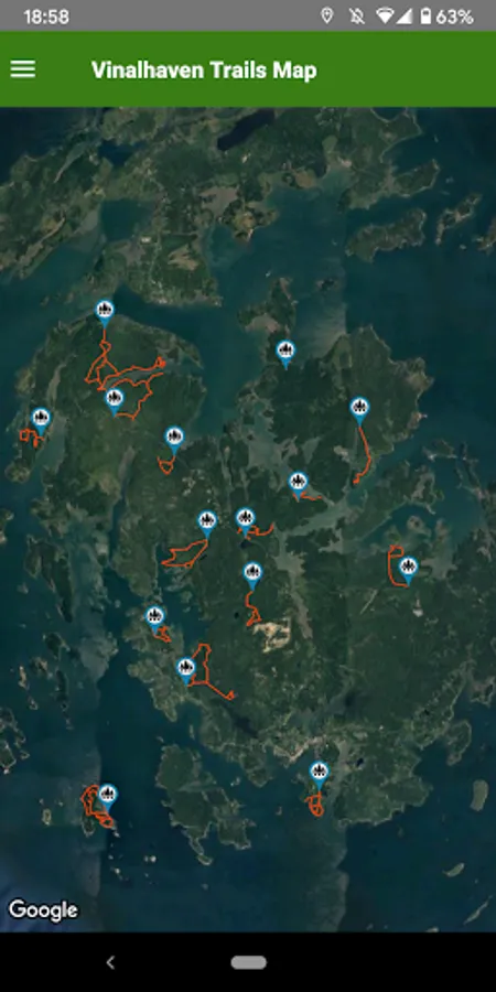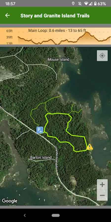 The Trails Map shows the maintained trails with the main trails (or loop) highlighted. A tap on the location button will move the map center to your current location (on the trail).