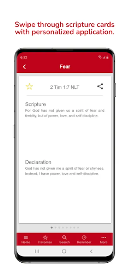 Swipe through cards that present scriptures with personalized application. Save a card to your favorites for quick access later.