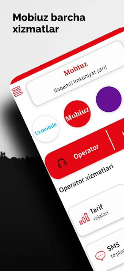 Ilova hajmi kam bo'lganligiga qaramay juda ko'p xizmatlar mavjud. Ilova qulayliklaridan biri asosiy ekranda turib Tarif haqiqada ma'lumot olishingiz mumkin. Bu jarayon quyidagicha: Ilovaning eng so'ngi versiyasini yuklab olasiz. Asiy ekragdagi "Tarif rejalari" tugmasiga 2 soniya tegib turasiz.
