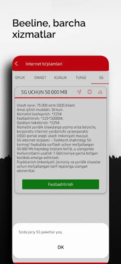 Beeline Internet to'plamlar(oylik,kunlik,non stop,tungi)