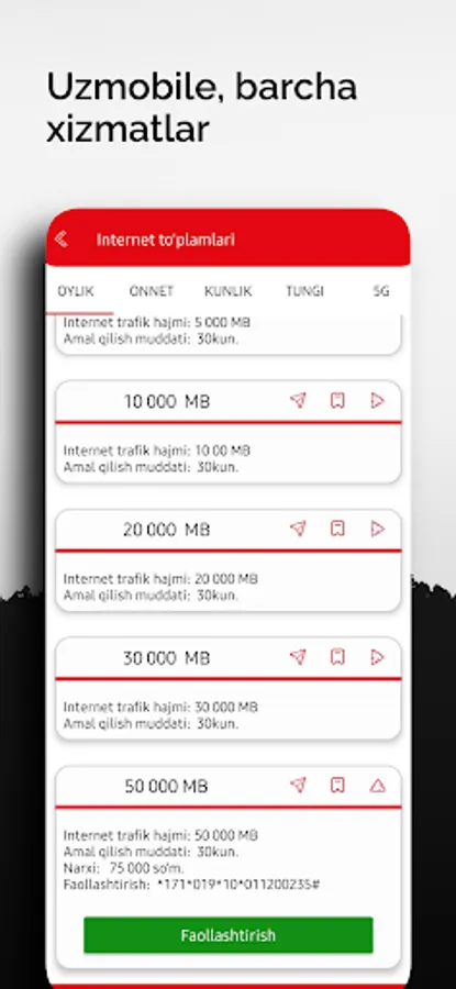 Uzmobile Internet to'plamlar(oylik,kunlik,non stop,tungi)