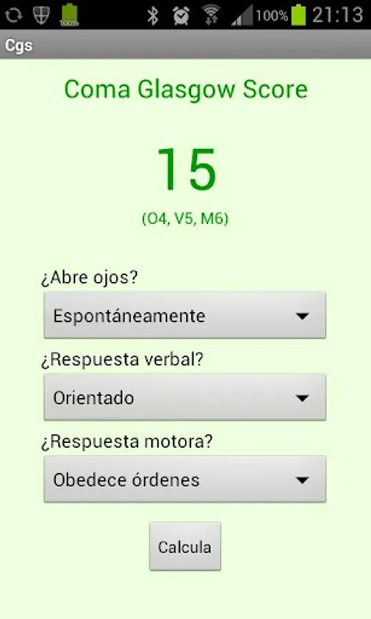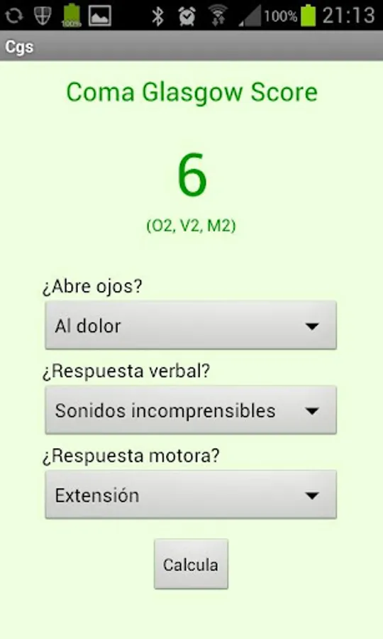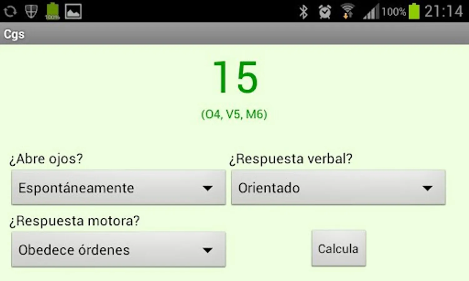 Simple and practical, uncomplicated. Choose exploration through drop-down and calculate the Glasgow Coma Scale. Includes itemized points (E, V, M).