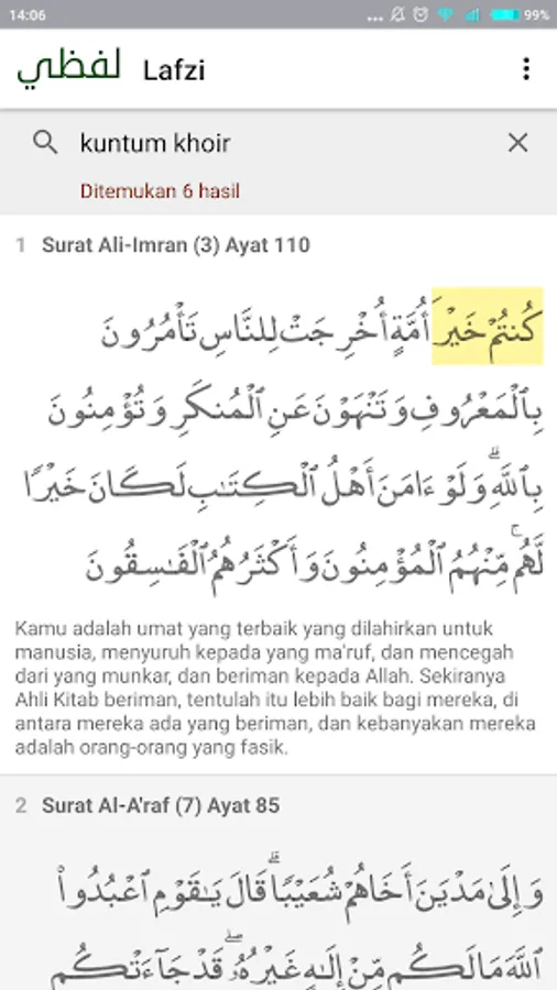 Lafzi is a lafadz search application on the Koran. This application can make it easier for you to search for certain verses in the Koran only with ordinary Latin scripts based on pronunciation of Indonesian speakers.