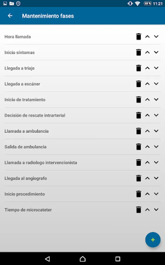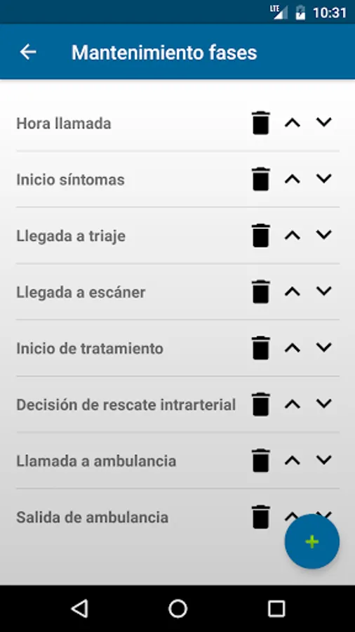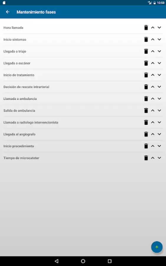 Once installed on the device, the first time it is opened, we set the PHASES section (top right) we want to fill. Depending on the workplace and staff may interest one or the other. You can create new icon with "add", reorder or delete existing (marking the red cross).