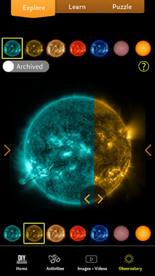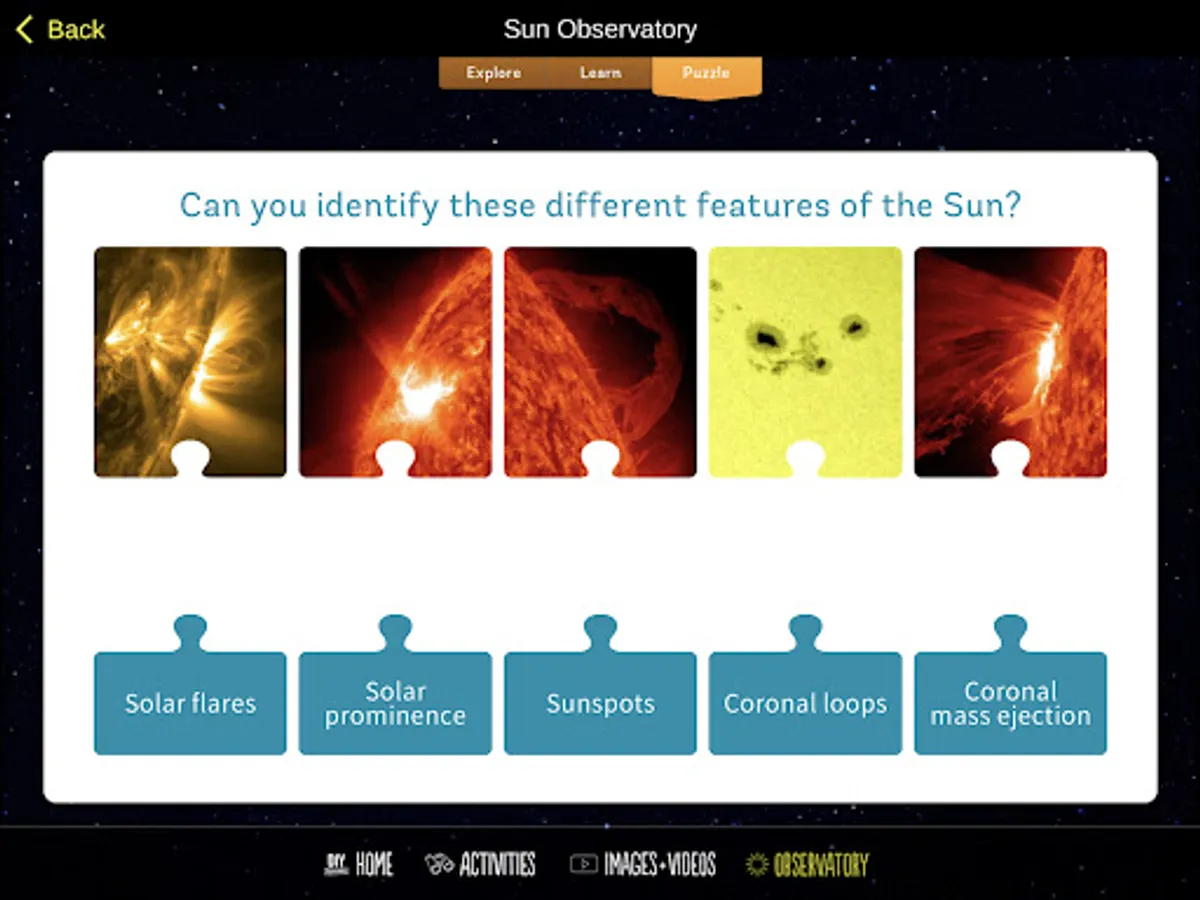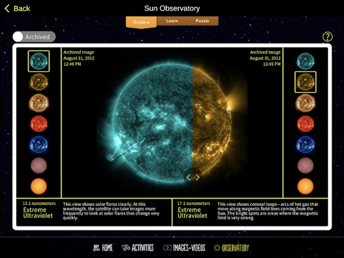 Want to see the Sun right now in different wavelengths? Use DIY Sun Science to view live images of the Sun from NASA’s SDO satellite in the Sun Observatory. Afterwards, you can learn more about the solar activity you observed and test your new knowledge.
