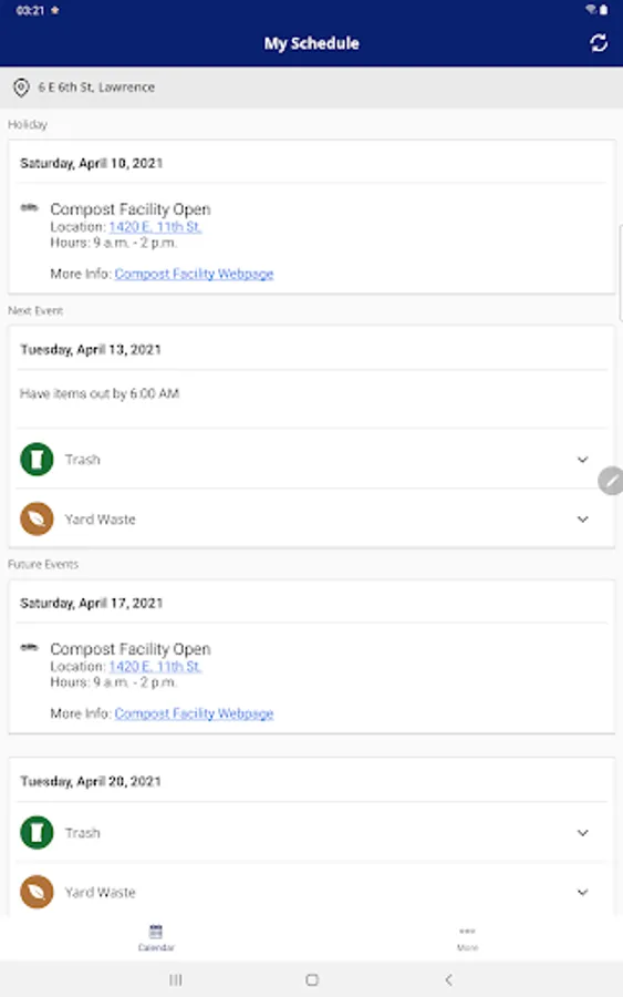 Garbage and recycling schedules and reminders for City of Lawrence. View your garbage and recycling schedule and receive collection notifications all from within this app.