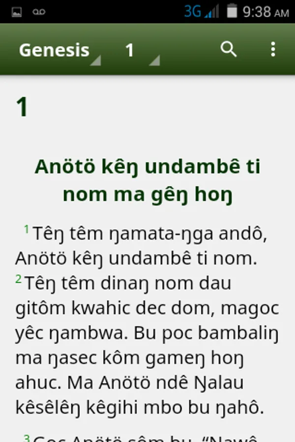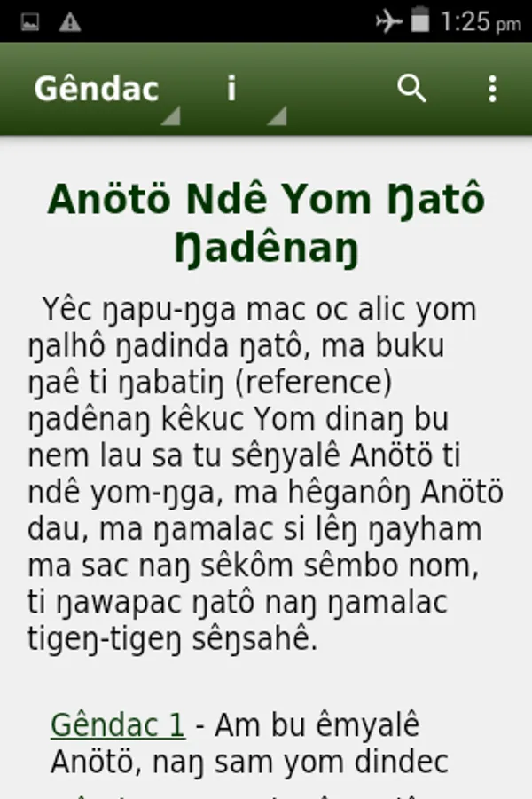 Yom naŋ yêc aplikesen/progrem dindec ŋalôm naŋ Anötö ndê Yom Lêŋsêm Wakuc, ma Genesis ti yom ŋatô naŋ meŋ akêŋ Yom Lêŋsêm Akwa (Old Testament), naŋ sem kwi sip Yom Gawac. Sem Yom Lêŋsêm Akwa hoŋ kwi dom, magoc yom daêsam naŋ yêc ŋadênaŋ Om-ŋga (Lectionary Readings) ma yom ŋatô whiŋ, naŋ sem kwi ma am oc tap sa yêc applikesen dindec ŋalôm. Yom Genesi-ŋga sêpuc sip bapia teŋ yala 1996. Tiŋambu sem yom yêc Anötö ndê Yom Lêŋsêm Wakuc hoŋ kwi, ma sêpuc sip bapia têŋ yala 2001. Ma yom ŋatô akêŋ Yom Lêŋsêm Akwa naŋ sem kwi su, naŋ sêpuc sip bapia têŋ yala 2004, tu bu lau sêŋsahê-ŋga. (Published as a trial release in “Yom Ŋatô akêŋ Yom Lêŋsêm Akwa”, 2004, Lae, PNG.)