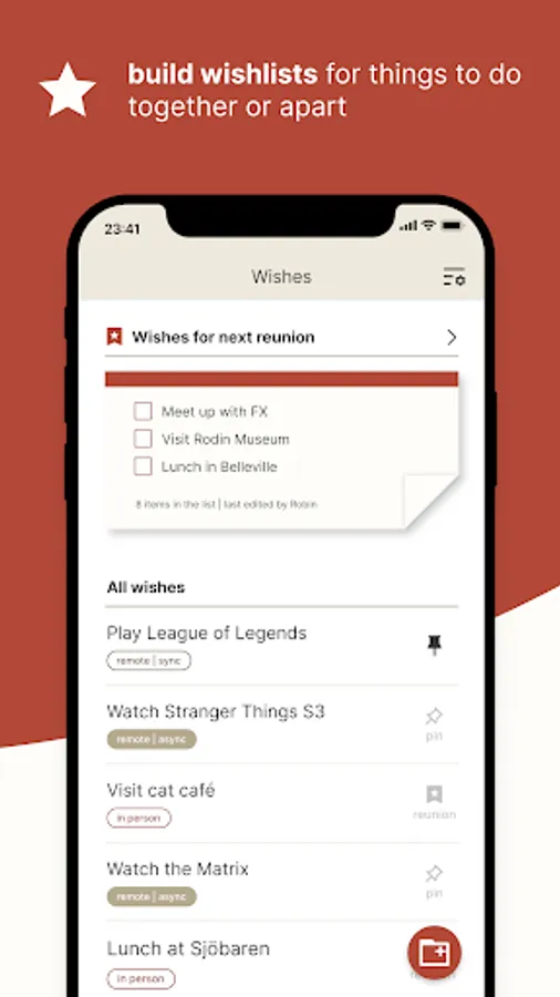 - Build a wishlist of places to visit, shows to watch, games to play and more. Never run out of ideas on what to do together.