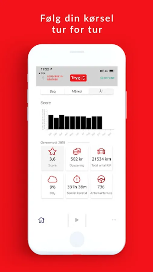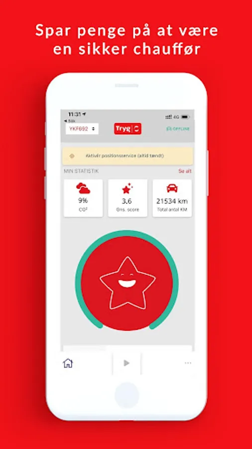 With TrygDrive, you pay less for your insurance policy, the better and more safely you drive. You pay your normal premium, and every time you go driving, you have the chance to earn bonus points. The bonus points are paid out once a year in connection with the renewal of your policy. After each car journey, the app will tell you how you scored as well as the number of bonus points we have transferred to your account. The scoring system is in stars from 0-5 stars, where 5 stars is the best score. If your score between 5-2,3 stars you drive with low risk of accidents and will be rewarded by receiving points to your account. 2,3-1,8 stars is neutral and if scoring 1,8-0 stars we deduct points from your balance. You are therefore able to directly impact the size of the bonus which you will receive at the end of the year – up to 30%!