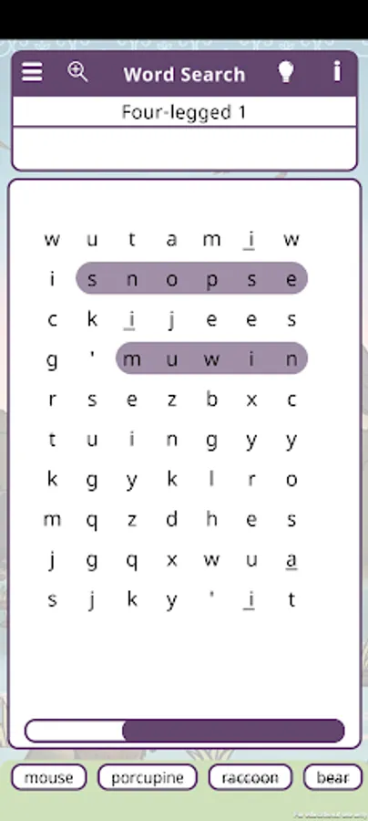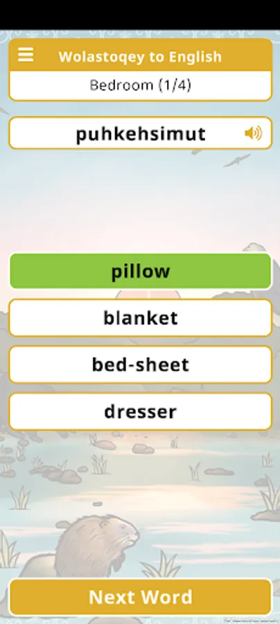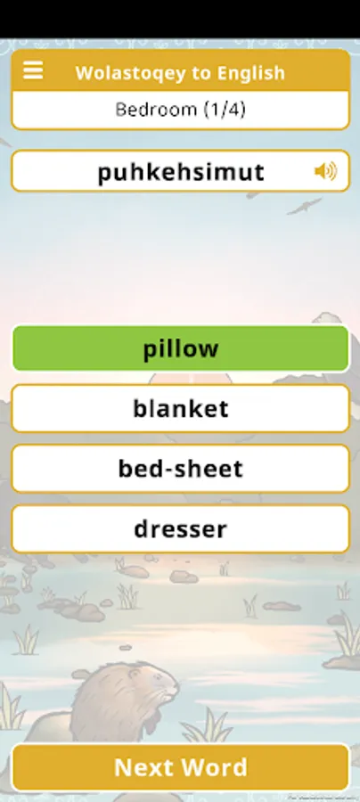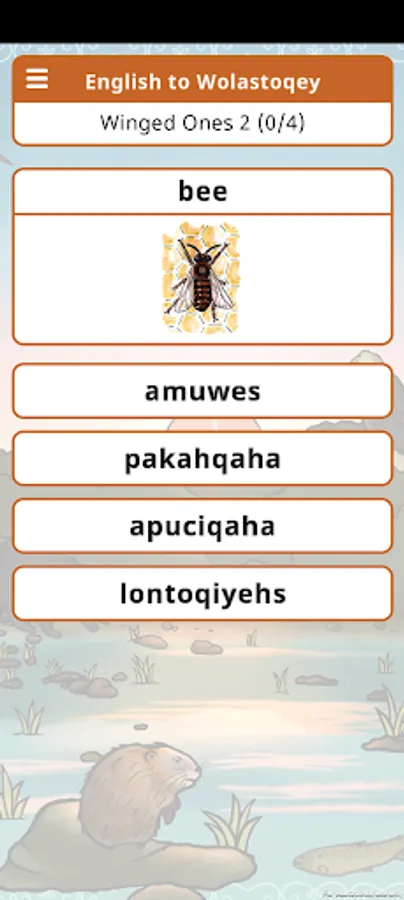 Build your Wolastoqey vocabulary with the Welamukotuk Vocab Builder game for your Android phone or tablet. Quiz yourself every day to learn different categories – animals, food, drinks, and more! The app includes: