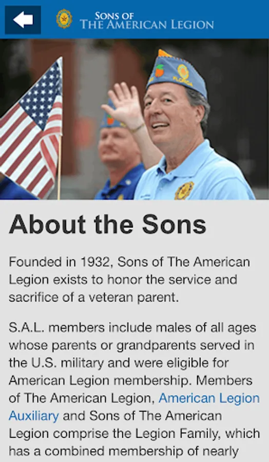 S.A.L. members include males of all ages whose parents or grandparents served in the U.S. military and were eligible for American Legion membership. Members of The American Legion, American Legion Auxiliary and Sons of The American Legion comprise the Legion Family, which has a combined membership of nearly 4.2 million.