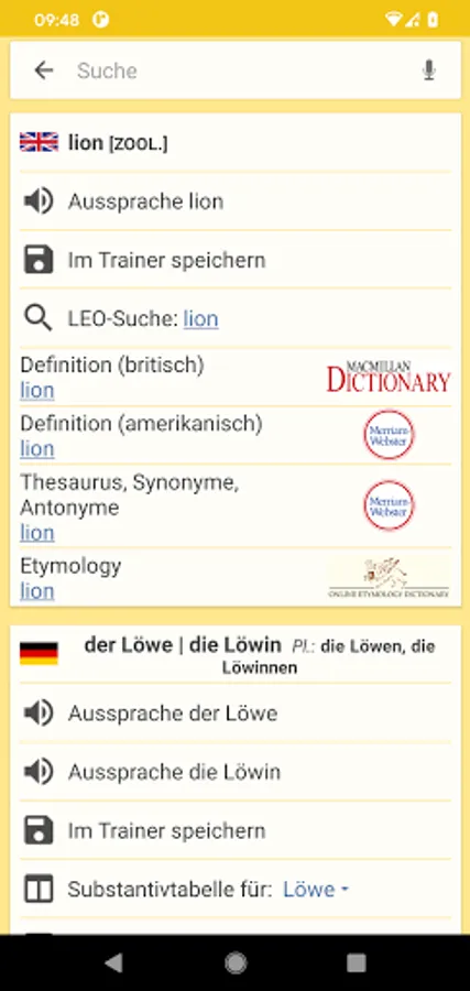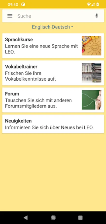 The application offers access to the LEO dictionaries, language courses and Survival Kits as well as the vocabulary trainer and forums.