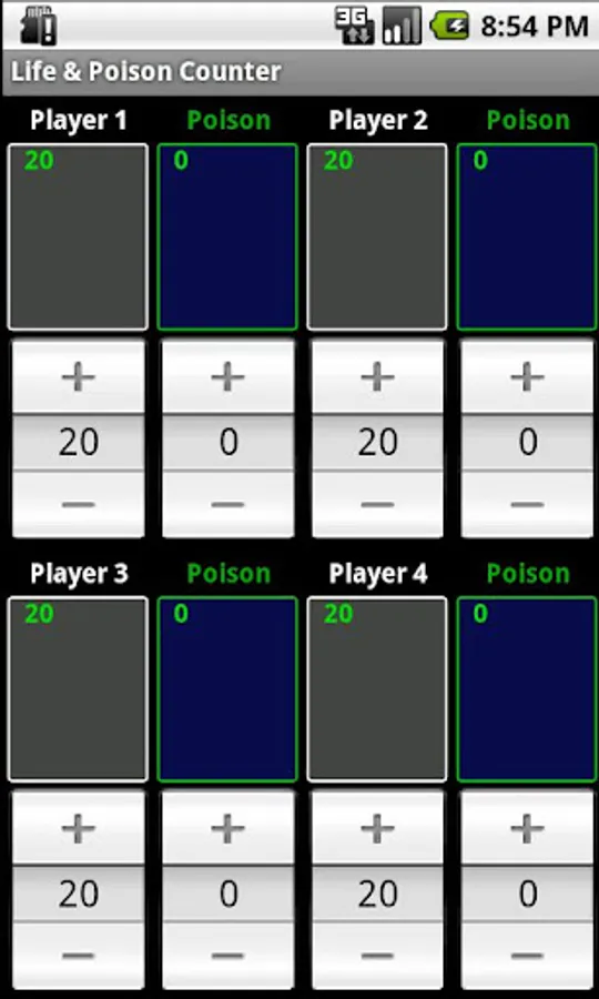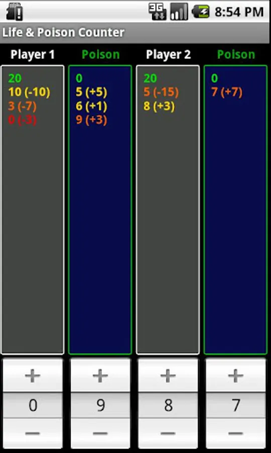 Life and Poison Counter is a small utility that is an extension of the Life Counter app, so check out the original application if you haven't already. It is for keeping track of life totals (and now poison counter totals) while playing the Magic: The Gathering card game.
