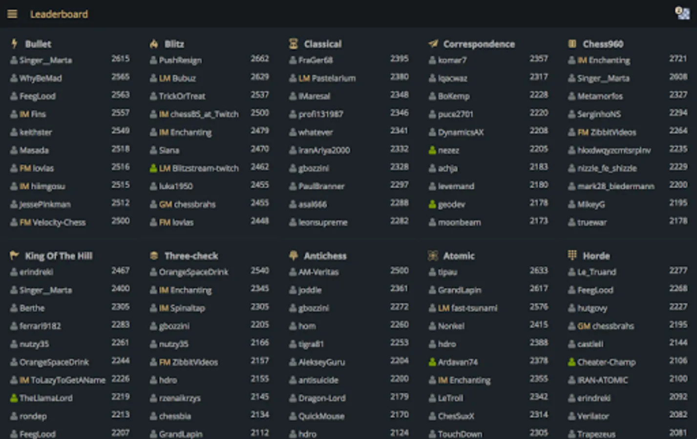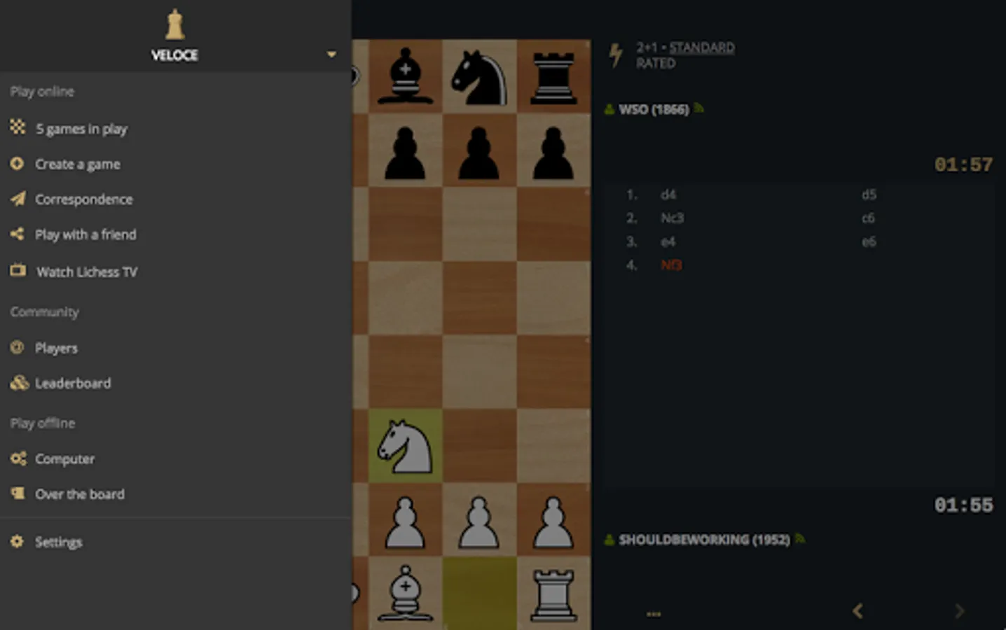 - Many variants, available online and offline: Crazyhouse, Chess 960, King Of The Hill, Three-check, Antichess, Atomic chess, Horde, Racing Kings