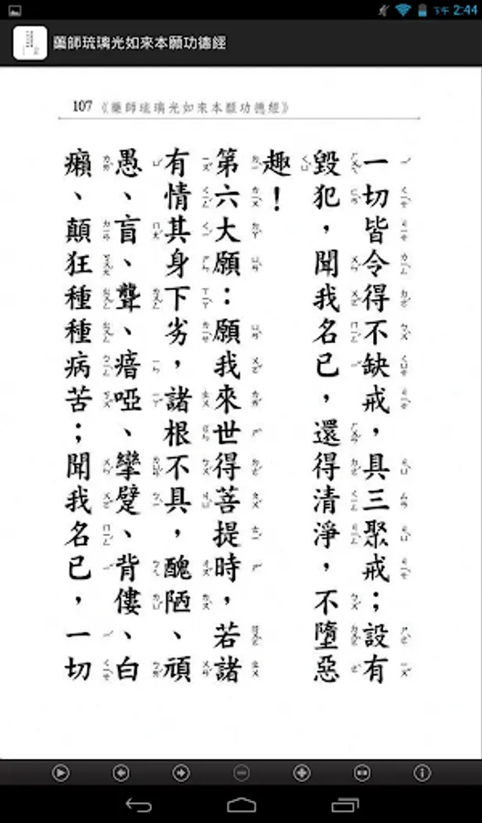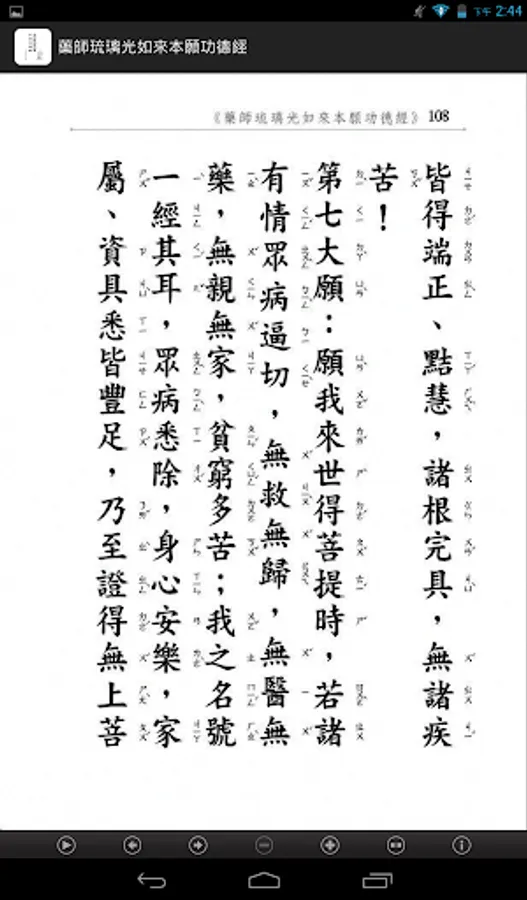 「第七大願:願我來世得菩提時,若諸有情眾病逼切,無救無歸,無醫無藥,無親無家,貧窮多苦;我之名號一經其耳,眾病悉除,身心安樂,家屬資具悉皆豐足,乃至證得無上菩提」。