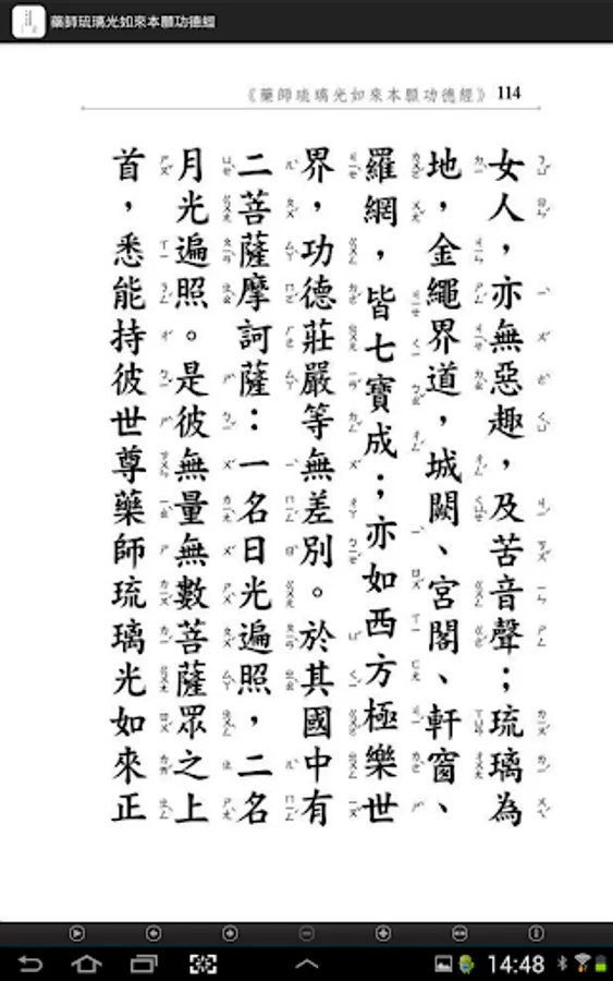 「復次、曼殊室利!彼世尊藥師琉璃光如來行菩薩道時,所發大願,及彼佛土功德莊嚴,我若一劫、若一劫餘,說不能盡。然彼佛土,一向清淨,無有女人,亦無惡趣,及苦音聲;琉璃為地,金繩界道,城、闕、宮、閣,軒、窗、羅網,皆七寶成;亦如西方極樂世界,功德莊嚴,等無差別。於其國中,有二菩薩摩訶薩:一名日光遍照,二名月光遍照。是彼無量無數菩薩眾之上首,次補佛處,悉能持彼世尊藥師琉璃光如來正法寶藏。是故曼殊室利!諸有信心善男子、善女人,應當願生彼佛世界」。