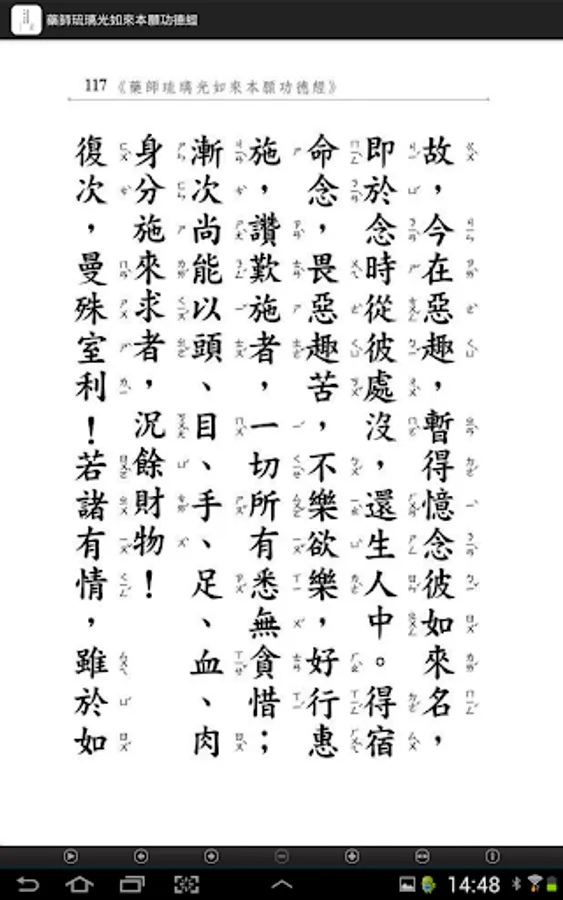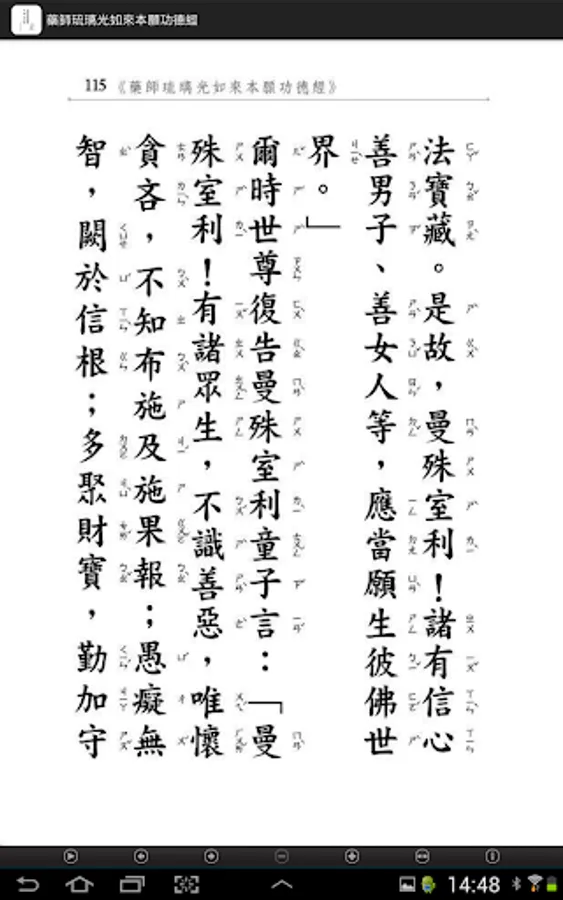 爾時、世尊,復告曼殊室利童子言:「曼殊室利!有諸眾生,不識善惡,惟懷貪吝,不知布施及施果報,愚癡無智,闕於信根,多聚財寶,勤加守護。見乞者來,其心不喜,設不獲已而行施時,如割身肉,深生痛惜。復有無量慳貪有情,積集資財,於其自身尚不受用,何況能與父母、妻子、奴婢作使,及來乞者?彼諸有情,從此命終生餓鬼界,或傍生趣。由昔人間曾得暫聞藥師琉璃光如來名故,今在惡趣,暫得憶念彼如來名,即於念時從彼處沒,還生人中;得宿命念,畏惡趣苦,不樂欲樂,好行惠施,讚歎施者,一切所有悉無貪惜,漸次尚能以頭目手足血肉身分施來求者,況餘財物?」