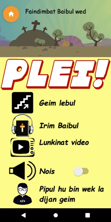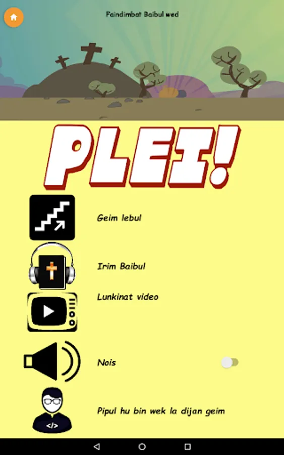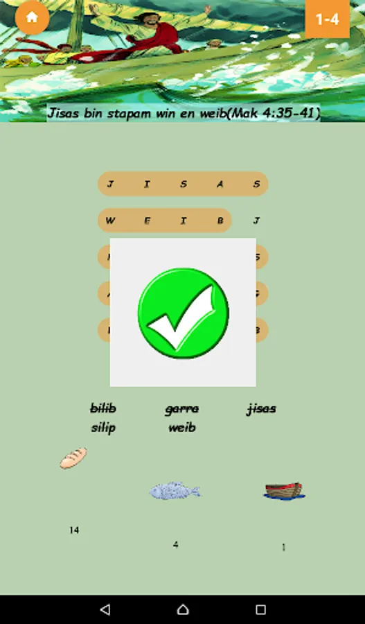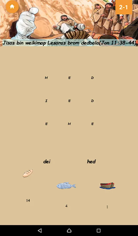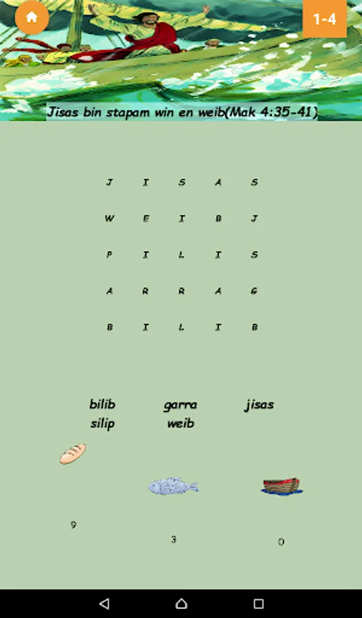 Forty four levels of word find puzzles based on stories in the Kriol Bible. Collect bread, fish and boat points to unlock letters, words and levels. Progress through the game to harder levels where you have to listen to a story to find the words.