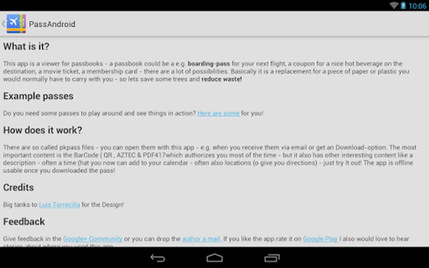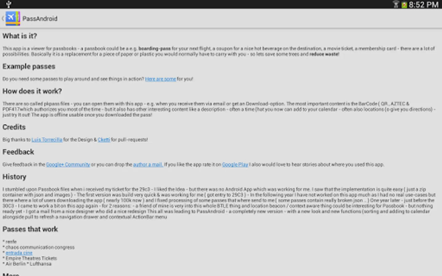I stumbled upon Passbook files when i received my ticket for the 29c3 - I liked the Idea - but there was no Android App which was working for me. I saw that the implementation is quite easy ( just a zip container with json and images ) - The first version was build very quick & was working for me ( got entry to 29C3 ) - In the following year I have not worked on this app much as I had no real use-cases but there where a lot of users downloading the app and I fixed processing of some passes that where send to me ( some passes contain really broken json .. )
