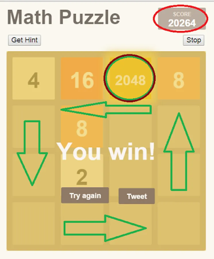 The game is won when a tile with a value of 2048 appears on the board, hence the name of the game. After reaching the target score, players can continue beyond 2048. When the player has no legal moves (there are no empty spaces and no adjacent tiles with the same value), the game ends.