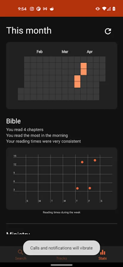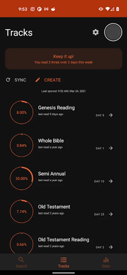 Tracks will help you create customized Bible reading schedules, read each day's portion, track your progress, bookmark where you left off, mark your favorite verses, summarize each day, and notify you when you are behind. You can read as much or as little as you want, make a pray-reading schedule, study or memorize a few verses at a time and adjust as you go along for ultimate personalization.