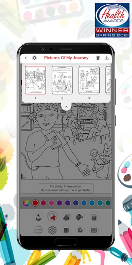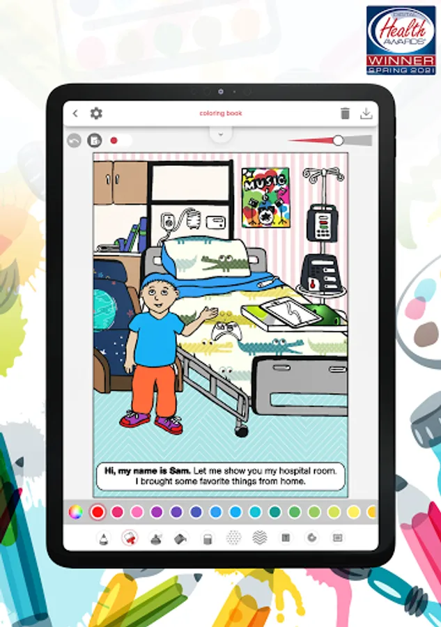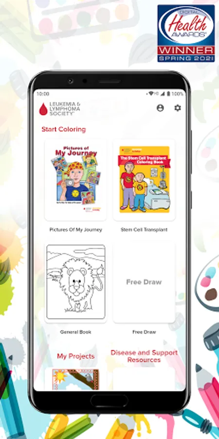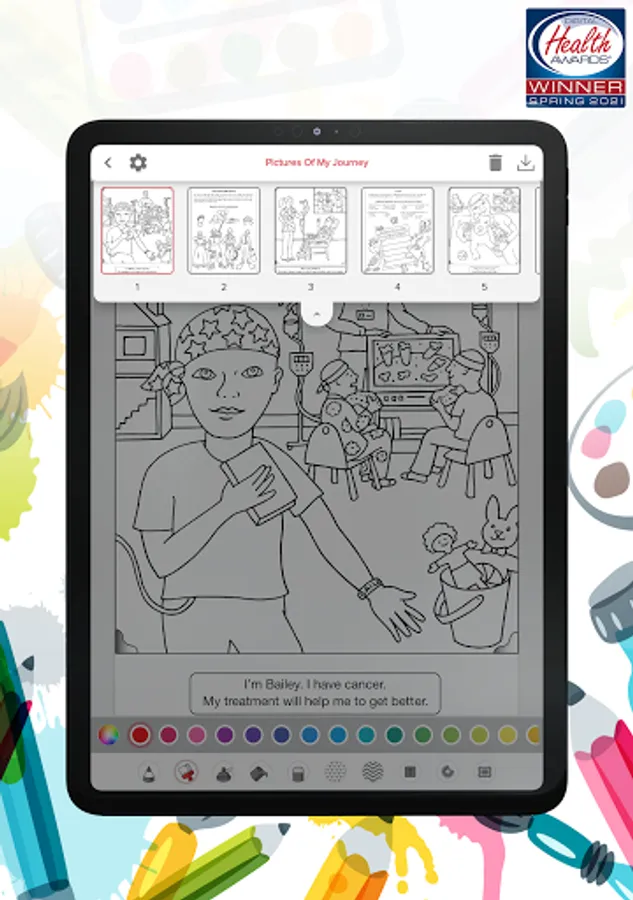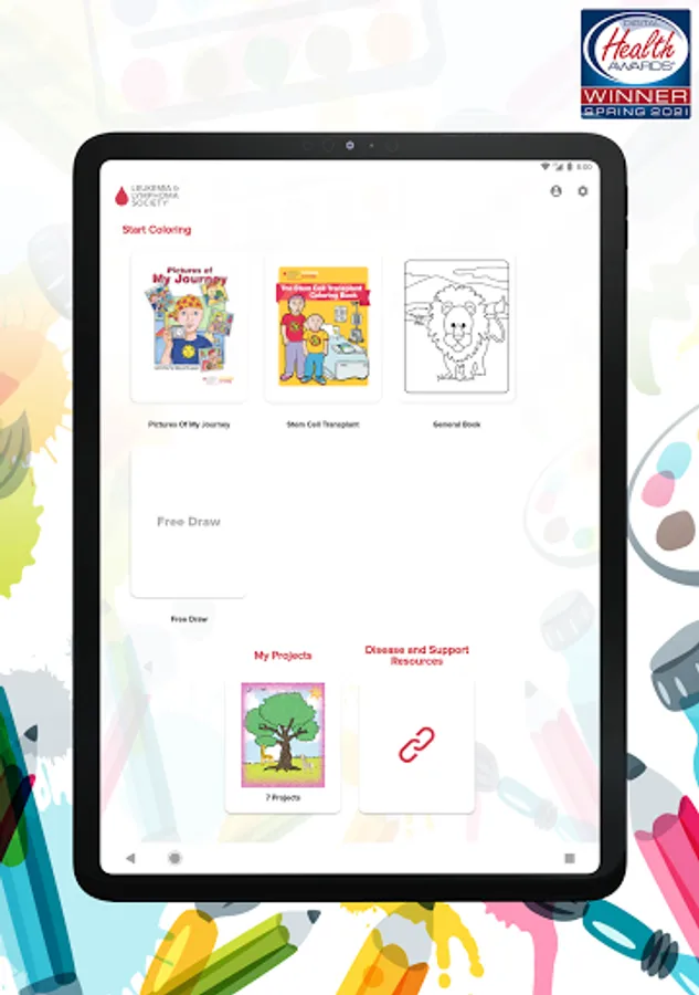 The app includes blank canvases, general coloring pages, and pages from the LLS coloring books Pictures of My Journey—Activities for Kids with Cancer and The Stem Cell Transplant Coloring Book. This app can be used anywhere and may help pass time in waiting rooms or during treatment.